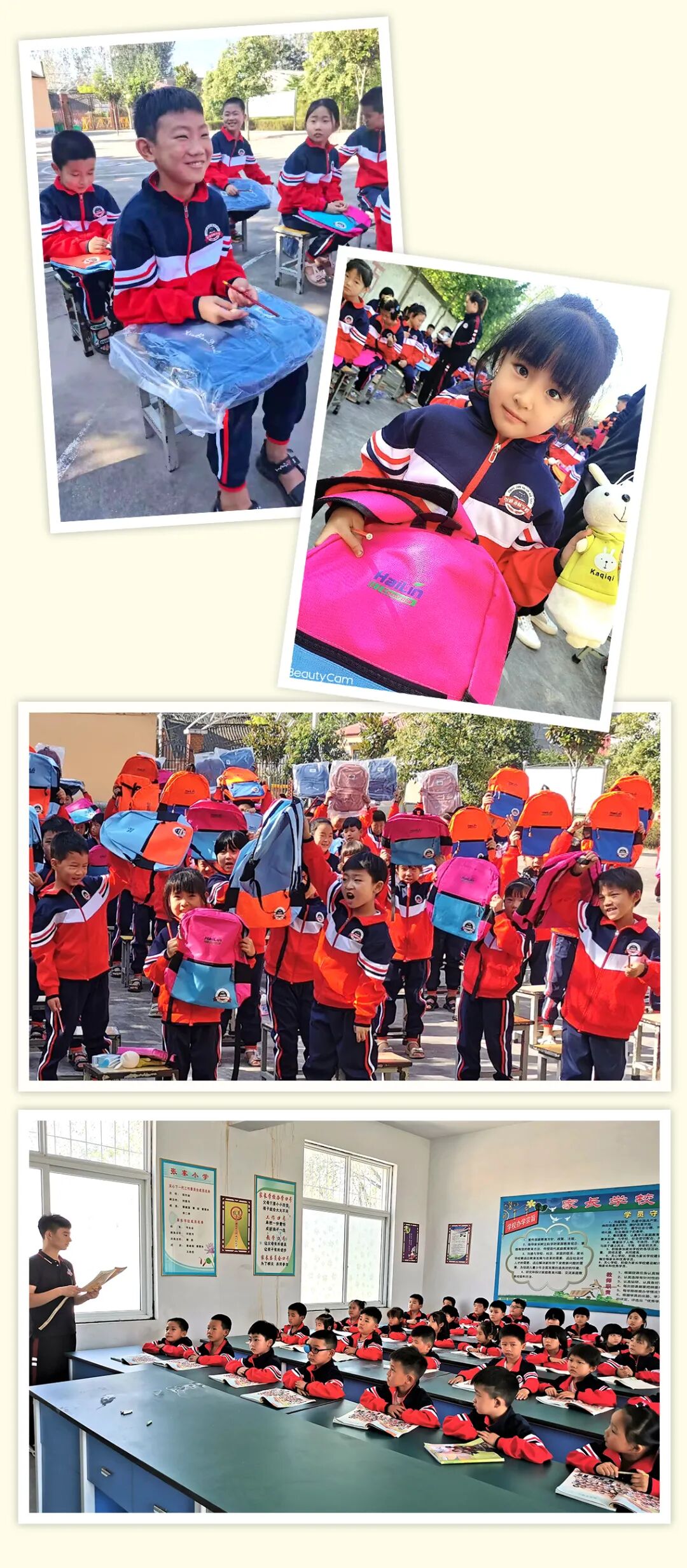 孩子们身穿新校服,手捧新书包、新文具,整齐的坐在操场上,一张张朝气蓬勃的笑脸,沐浴在清晨的阳光里,让我们看到了张寨海林学校的老师带领着孩子们在这个充满爱与希望的大家庭中快乐学习,茁壮成长!