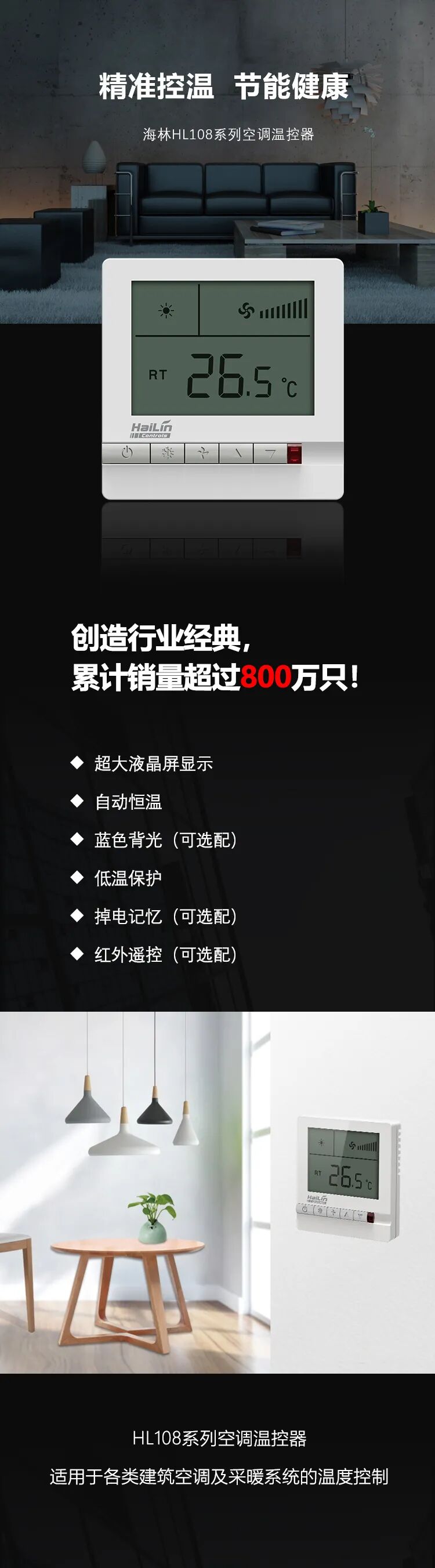 海林HL108系列空调温控器适用于办公楼、住宅、酒店、医院、 学校及商业地产等建筑的室内温度控制,控制普通交流三速风机盘管和电动阀,通过按键可选择制热、制冷功能。