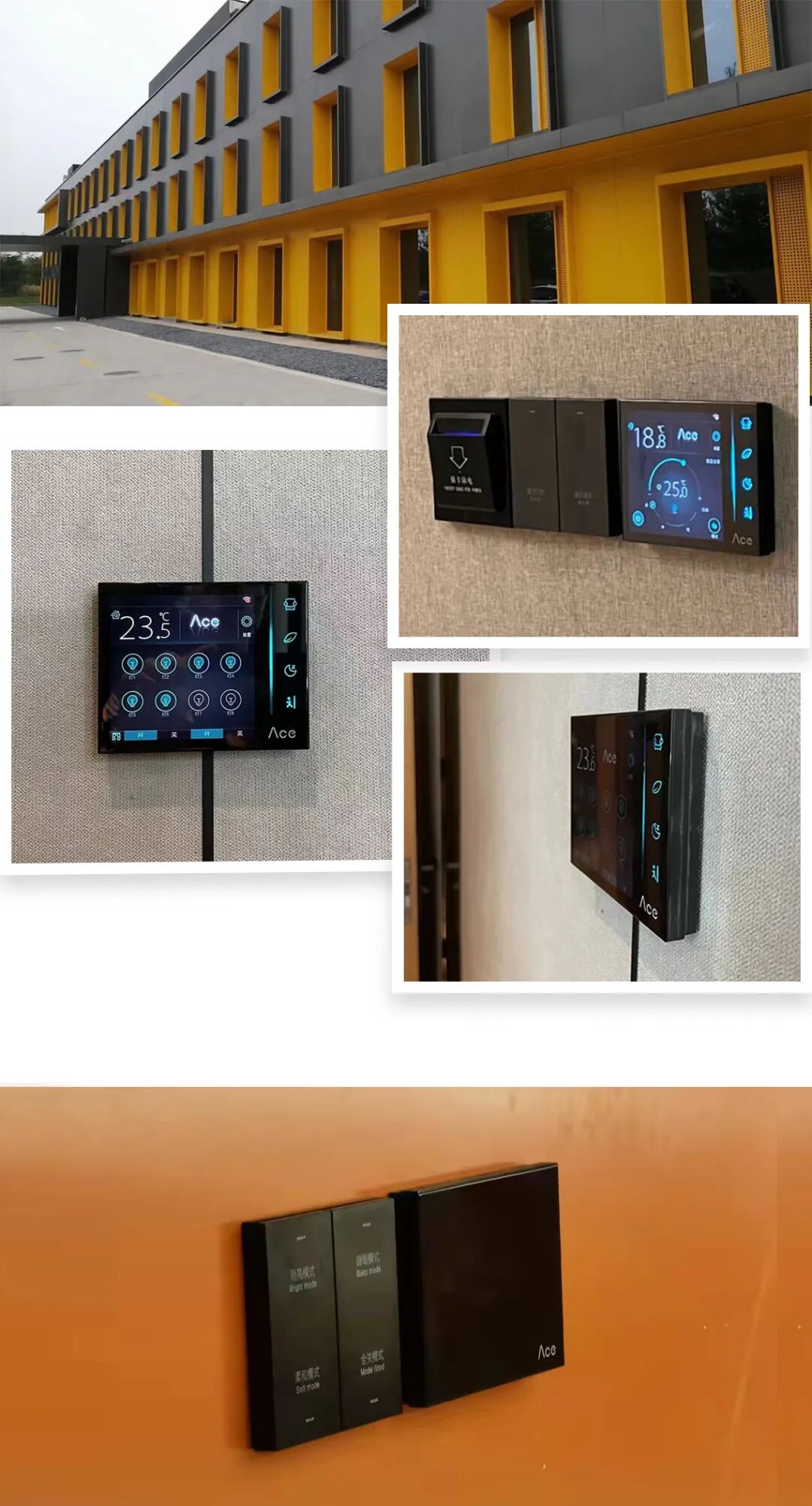 Ace 2.0 智能面板安装在门口处,用户可通过此面板下发情景模式,并可以单独的控制灯光、窗帘和空调温度;