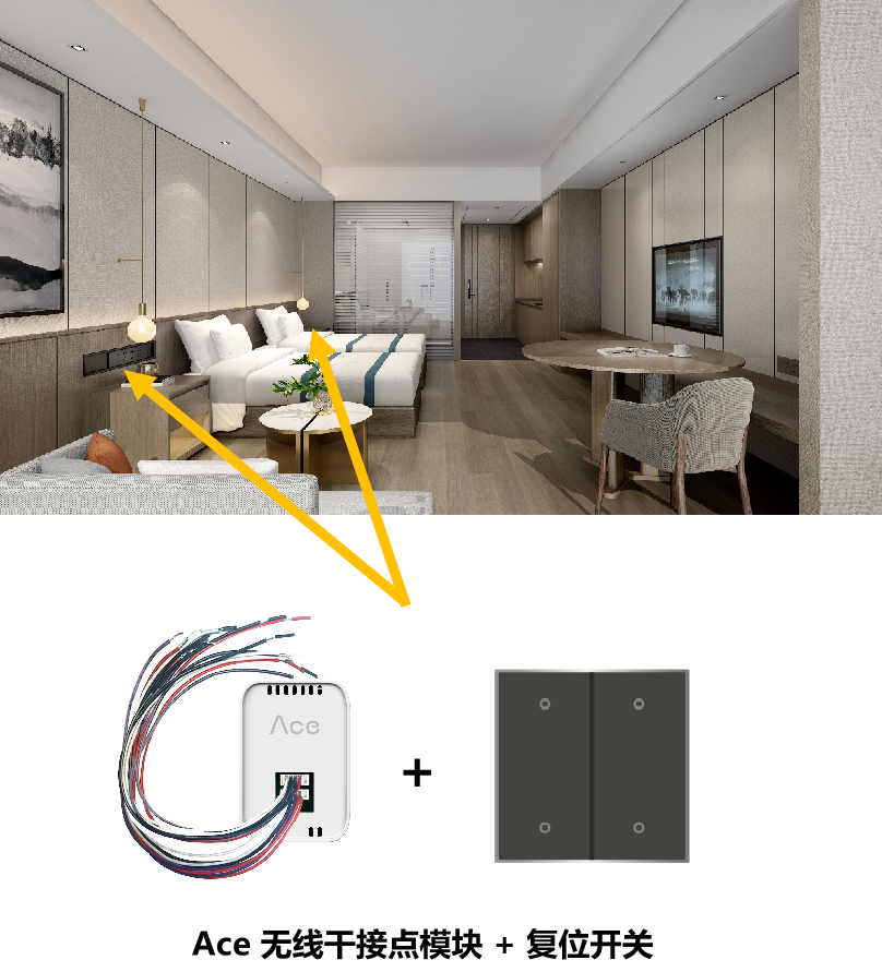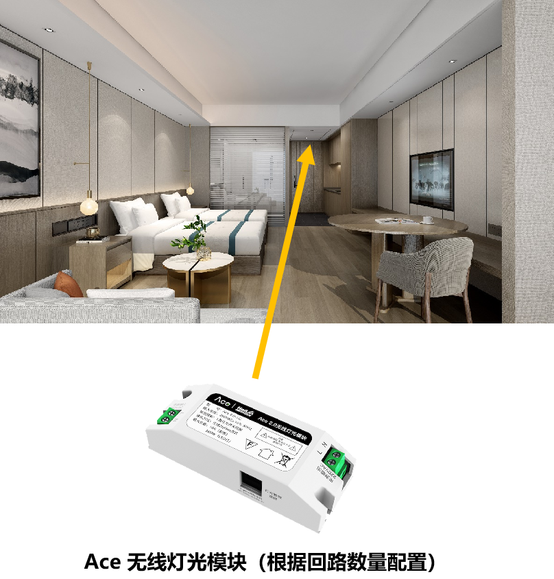 Ace 无线干接点模块支持与市面上任意品牌的复位开关进行匹配,实现与床头面板联动,实现房间控制;床头开关可以控制Ace 2.0的情景模式、灯光或窗帘,根据项目需求可以调整;干接点模块只需220V供电(可从旁边插座取电),无需其他任何布线,极大降低施工成本。
