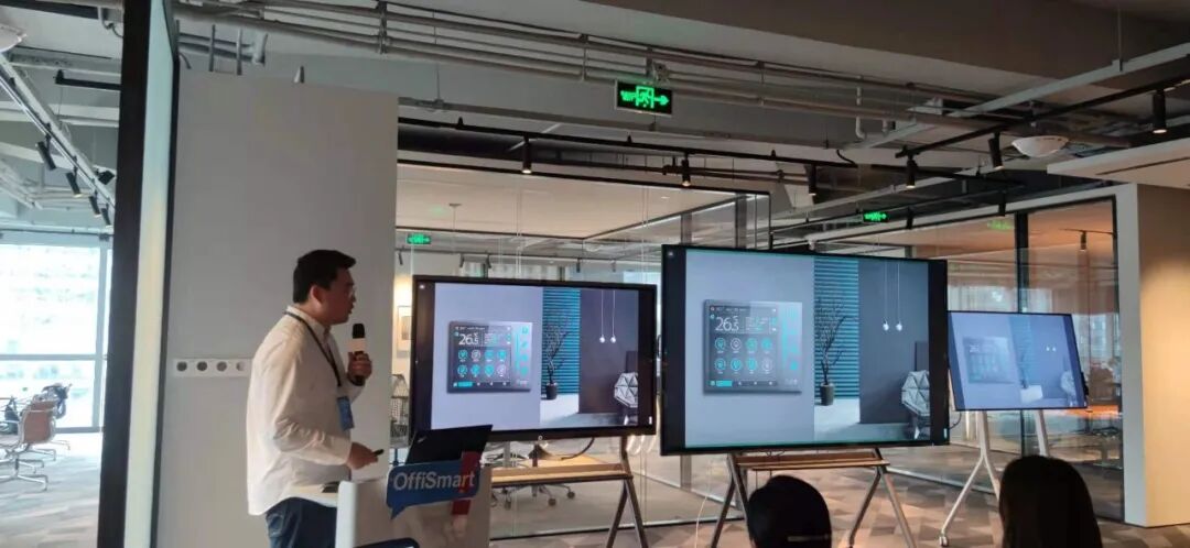 李总讲到海林Ace2.0全环境智慧办公系统采用微环境系统架构,每个会议室、办公区、餐厅等区域均采用Ace 2.0智能面板控制该区域的灯光、窗帘、空调、新风等设备,实现区域的智能化控制。