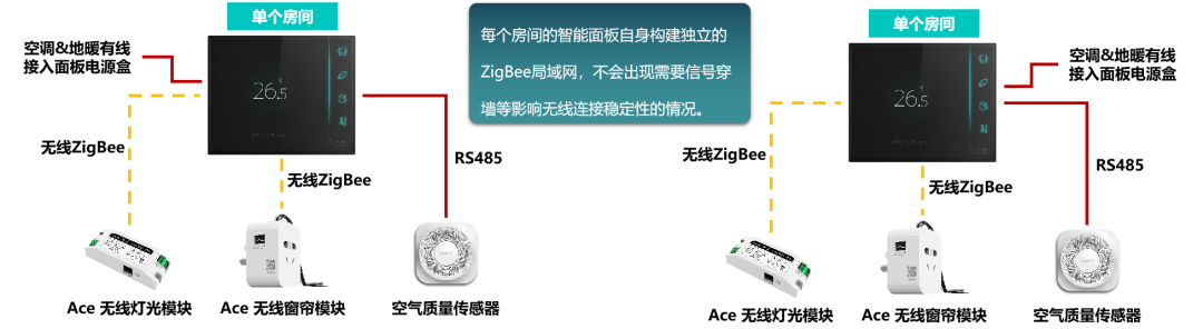 ▶ 采用改造的方式:在不动任何线材的情况下实现了智能化改造,将温控器面板直接替换为Ace 2.0智能面板 + 灯光回路上增加无线灯光模块 + 增加电动窗帘模块;