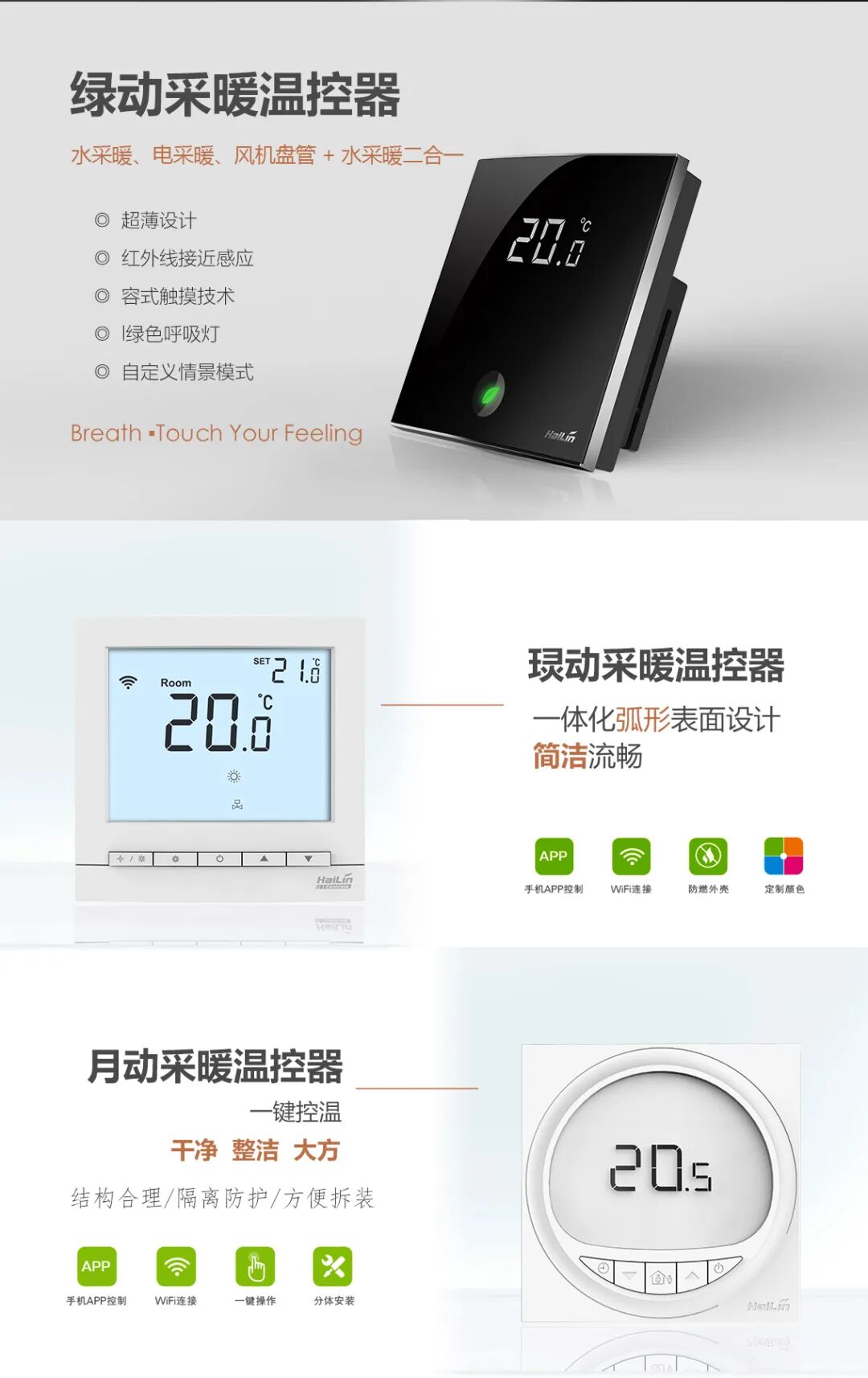 海林采暖温控器是国内最早的温控专业设备,产品适用于水采暖、电采暖,以及风机盘管和水采暖两联供系统的室内温度控制。