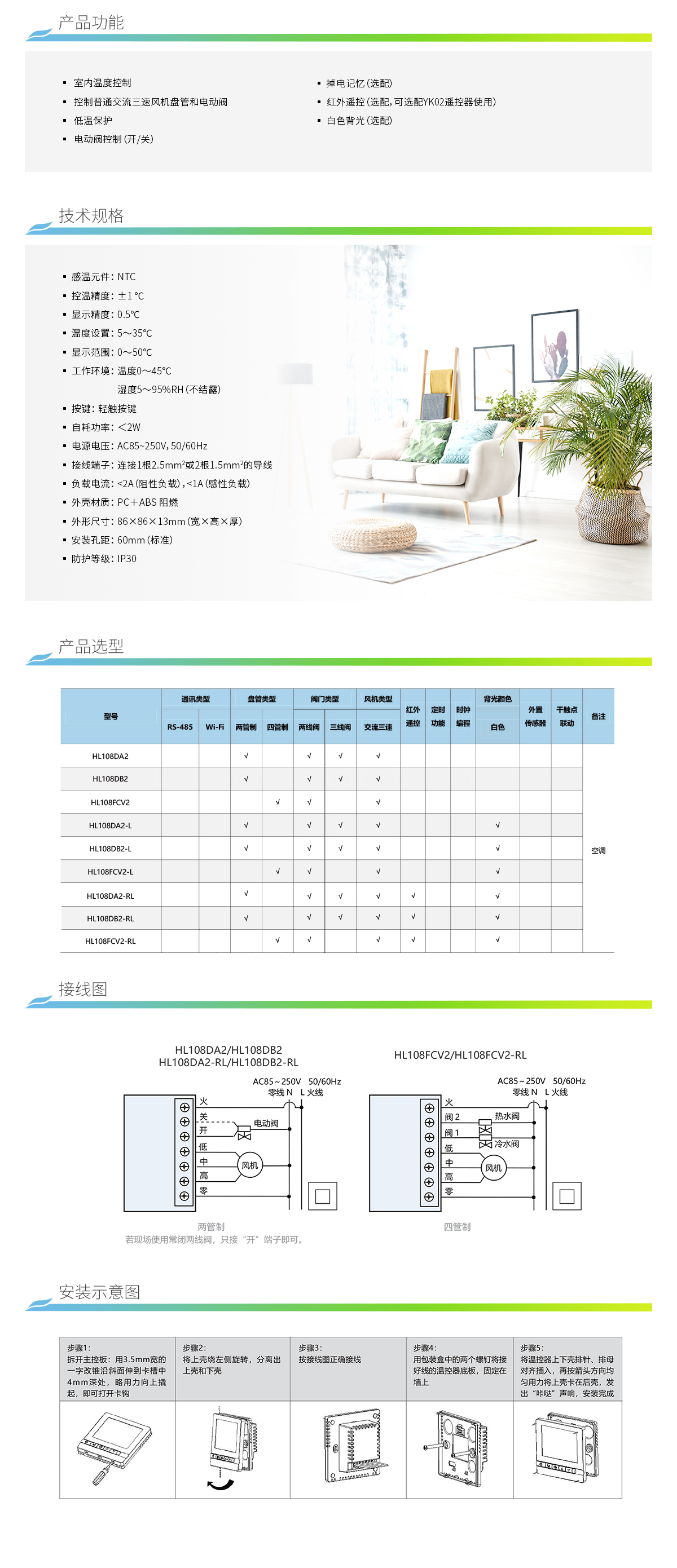 HL108系列温控器是海林经典款温控器,累计销量超过1000万 只。液晶屏设计,采用PC+ABS阻燃材料,产品寿命长,使用10年 以上不变色。 应用场景:住宅、办公写字楼、酒店、医院、商业楼宇及其它公共 建筑。 适用于室内温度控制,控制普通交流三速风机盘管和电动阀,通过 按键可选择制热、制冷模式。