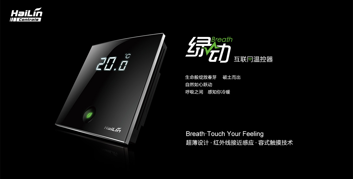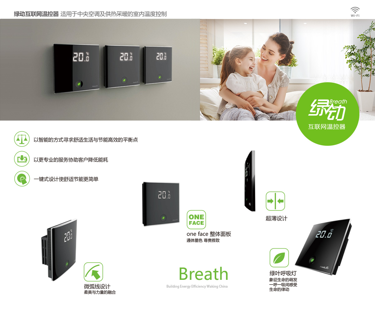 绿动温控器适用于家庭地板采暖系统或散热器采暖系统的室内温度控制。微弧线曲面设计彰显柔美与力量融合。面板整体睿墨含蓄、尊贵雅致。绿叶呼吸灯时尚点缀,如呼吸间感受生命律动,象征生命萌发。
