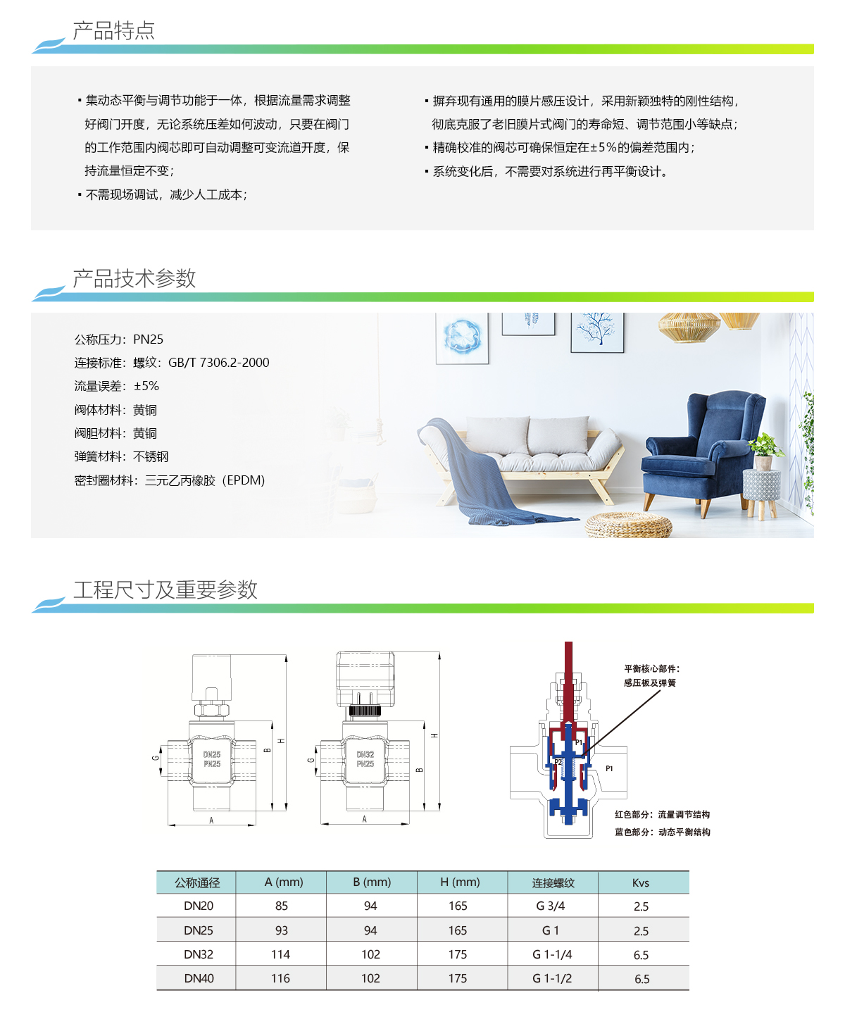 本系列产品集动态平衡与调节功能于一体,根据流量需求调整好阀门开度后,无论系统压差如何波动,只要在阀门的工 作范围内阀芯即可自动调整可变流道开度,保持流量恒定不变。该阀门采用新颖独特的刚性结构,彻底克服了老旧膜片式阀 门的寿命短、调节范围小等缺点。精确校准的阀芯可确保恒定在±5%的偏差范围内。
