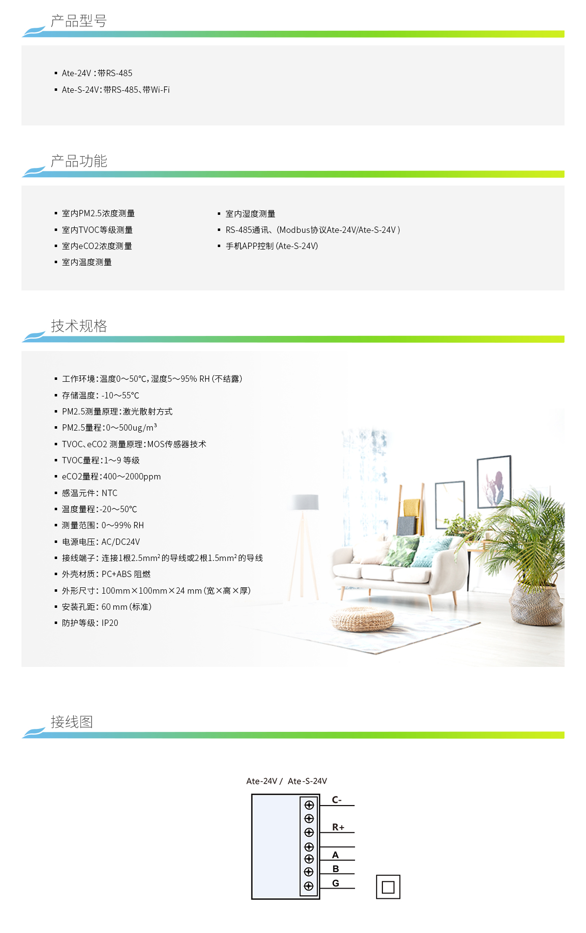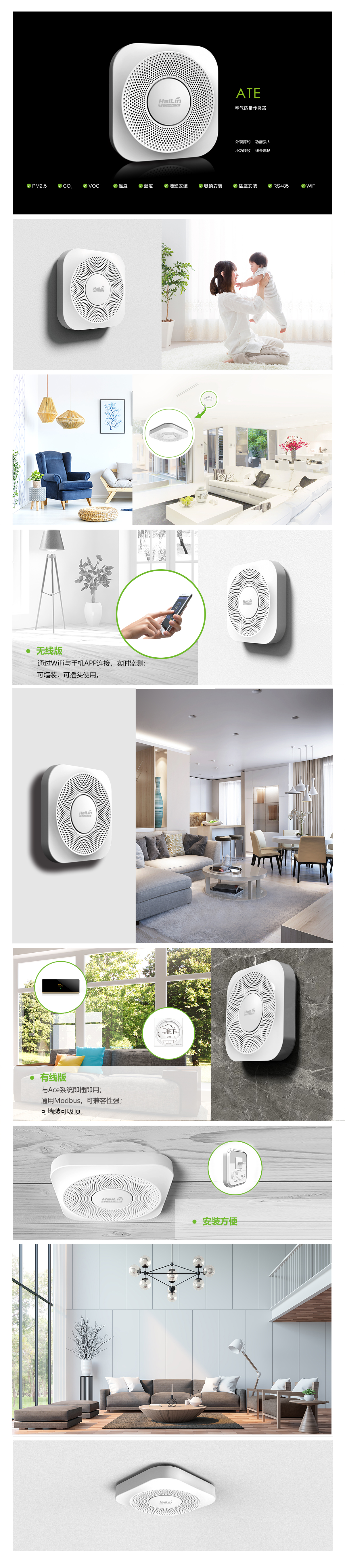 Ate是一款多合一的空气质量传感器,用于监测室内的PM2.5、CO2、 TVOC、温度及湿度,通讯方式可选RS-485、Wi-Fi、LoRa或Zigbee。用 于和楼宇自控系统、智能家居系统或独立的监测系统中。