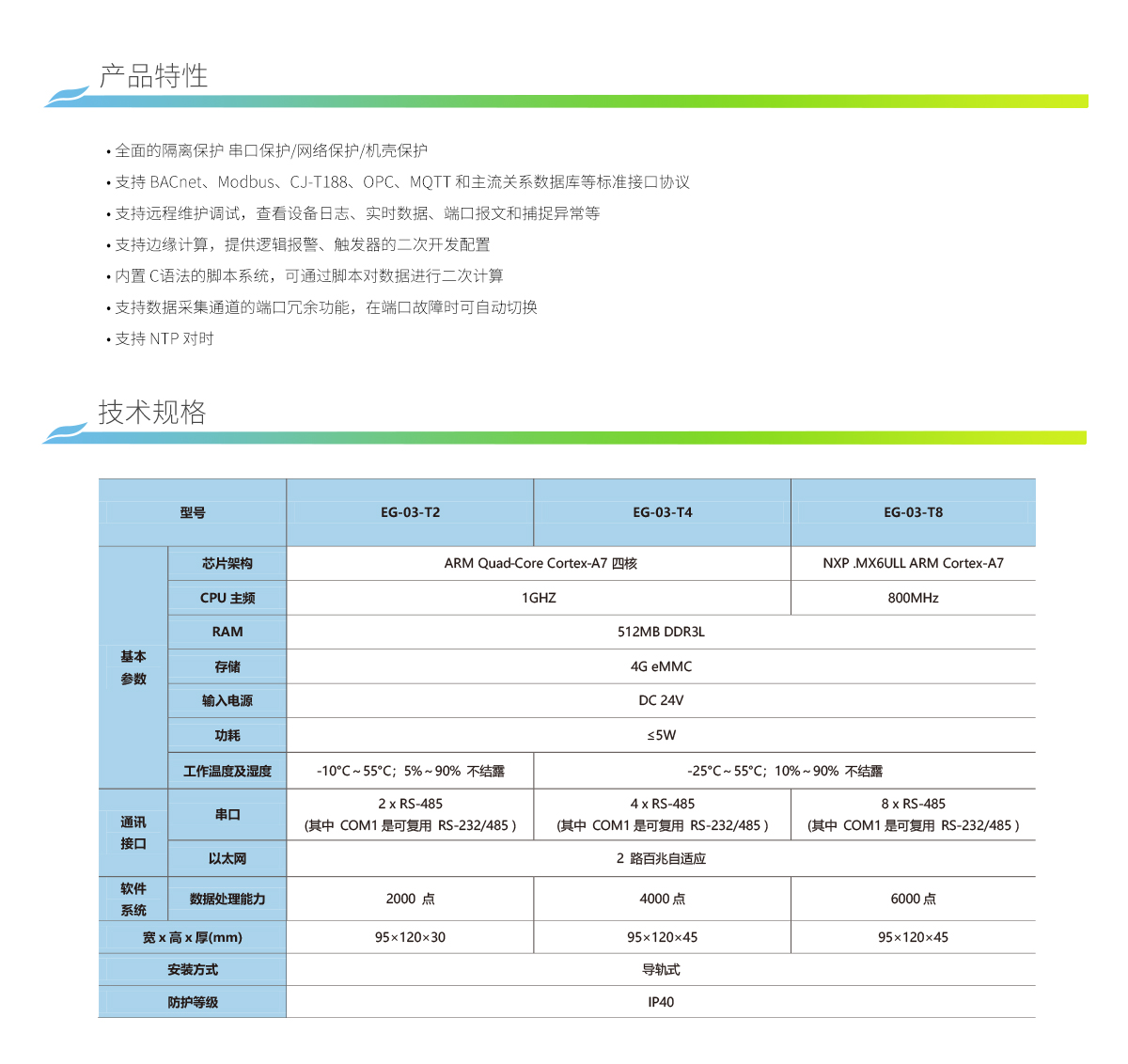 EG-03 智能协议转换网关可广泛应用于楼宇自控系统和能源计量系统。网关支持多种主流通讯协议,通过4G,以太网以及串口(RS-485/RS� 232)可根据项目要求灵活地完成各种上行 / 下行数据双向协议转换。 EG-03 系列智能网关可以很方便地集成楼宇自控系统中传感器、温控器、控制器和各种计量表具,将来自这些设备的数据进行格式转换、量程转换、数 据累加等计算处理,同时也可基于来自这些设备的原始数据或计算结果进行报警逻辑部署,并将原始数据或报警结果通过多种协议进行转发。