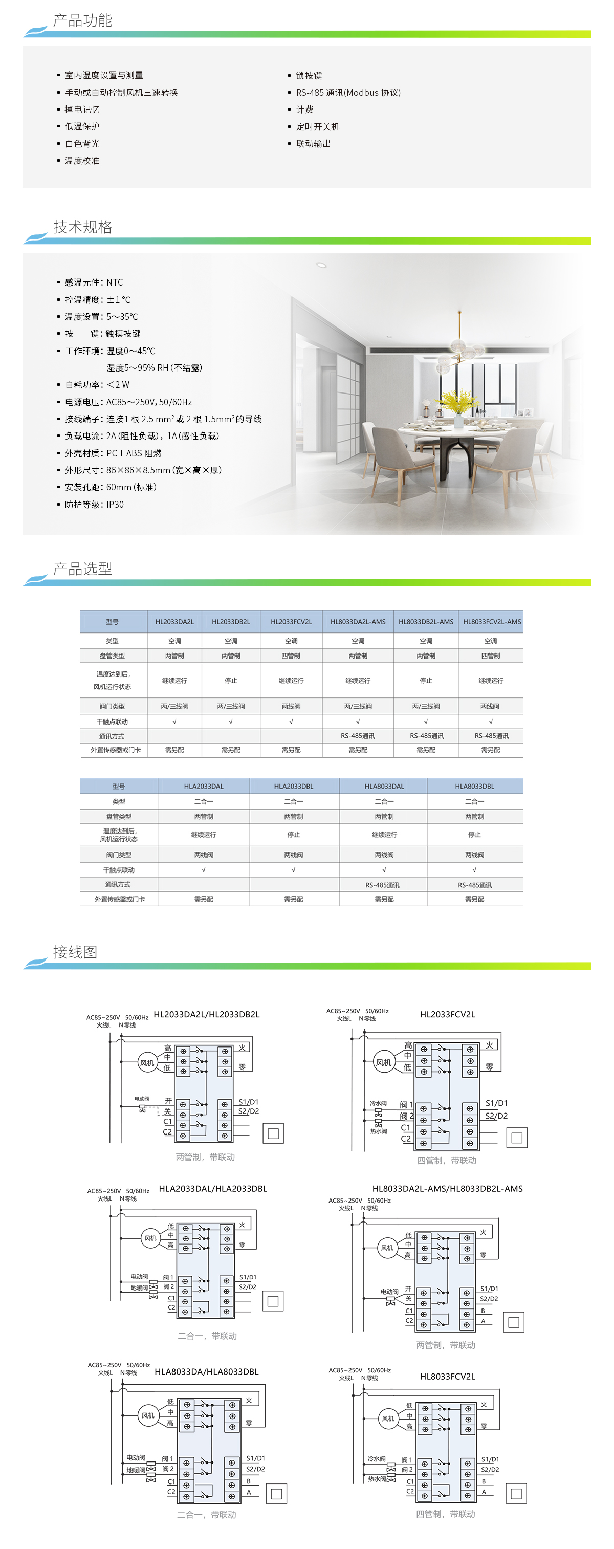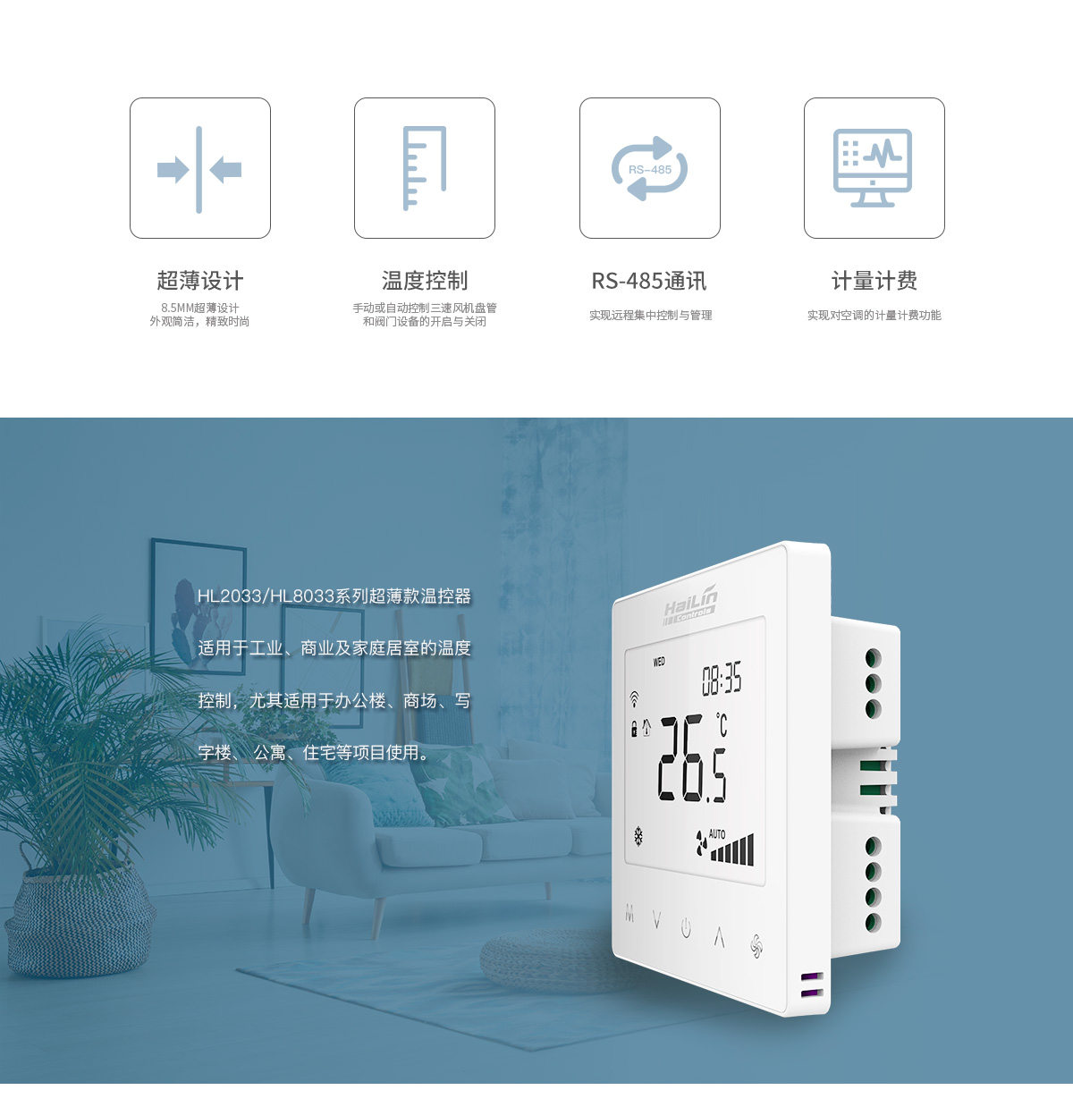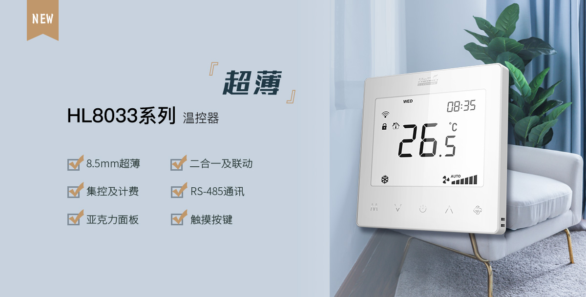超薄款:大液晶屏,空调采暖二合一,计量计费,联动控制,485通讯,实现远程集控。