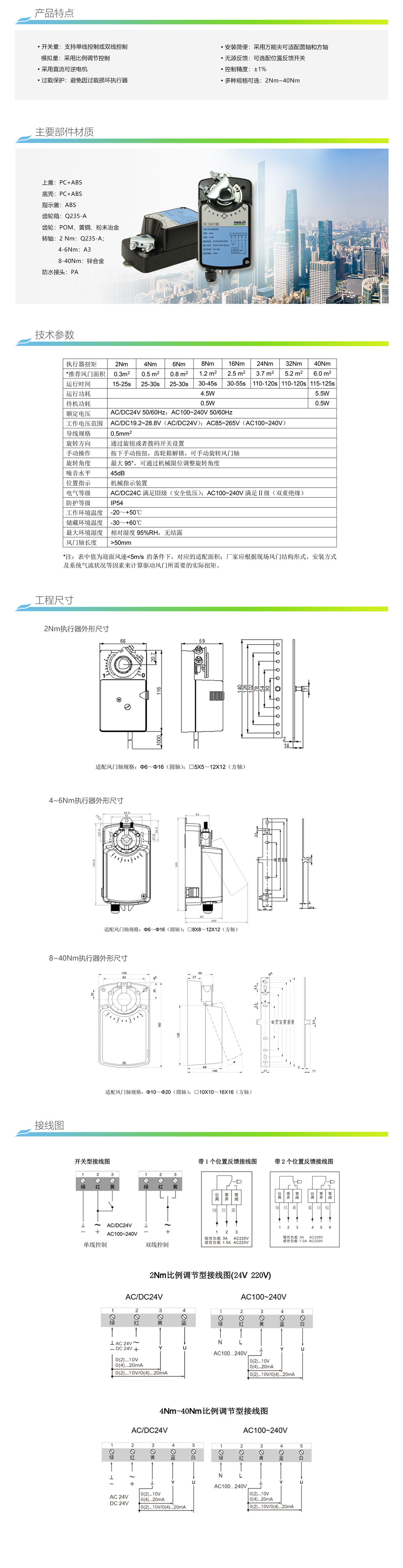 VA13 系列风门执行器适用于通风系统中,直接安装于风门、通风 百叶窗、风柜等装置上,能够实现浮点型、比例调节型(标准信号 DC0(2)-10V 或 4(0)-20mA)控制。通过 PLC、 DDC、温控器等控制信 号,对风门的开度进行调节,以控制风管道中的风量或风速,使风门 的开度始终保持在设定范围内,以满足风管道中对风量、风速的精确 控制。