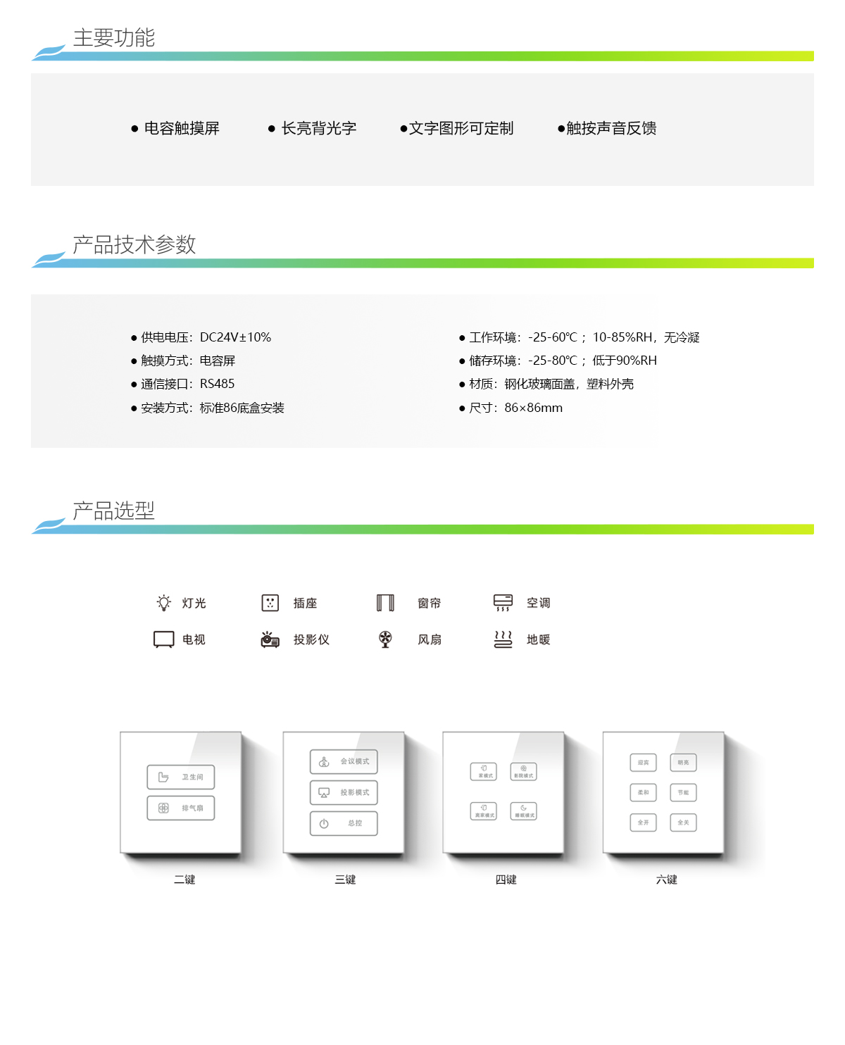 场景面板是输入单元的常用设备,安装于控制现场,用于对灯 光、窗帘、空调等进行开关、调光及场景控制,颜色、按键数、 文字可定制。