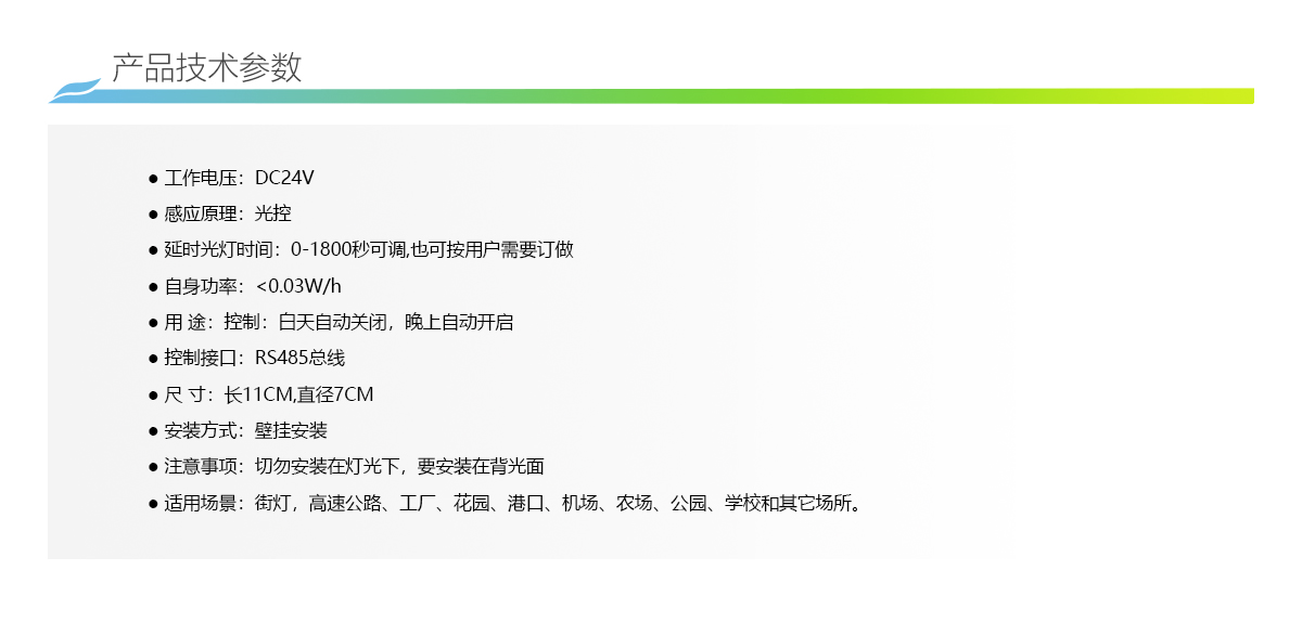 环境照度传感器根据光电控制原理设计而成的高精度节能产品,它通 过光电信号转换,以自然光控制照明灯具的亮与熄,即可及时照明, 又可节省电力。 ● 工作电源:DC24V,用于CPU工作电源及网络工作电源 ● 感应灵敏度:采用高灵敏照度传感器,高达16位采样精度 ● 感应原理:光控 ● 工作模式:可设置10级照度值,根据不同照度值触发10级不同的灯光亮度或场景模式 ● 控制方式:可通过触摸屏、面板按键使能或禁止感应功能,也可以通过定时器根据不同的时段灵活使能或禁止照度感应功能