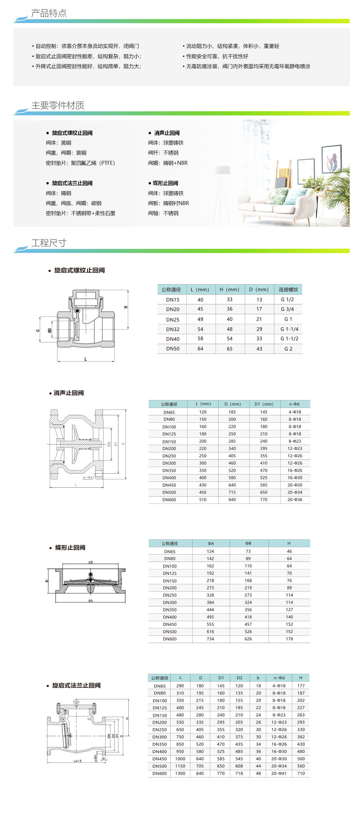 止回阀是指依靠介质本身流动而自动开、闭阀瓣,用来防止介质倒流的阀门。属于一种自动阀门,其主要作用是防止介质倒流、防止泵及驱动电动机反转,以及容器介质的泄放。适用于生活用水、给排水系统、污水处理系统、化工流体输送等系统的管道上作阻止介质逆流。