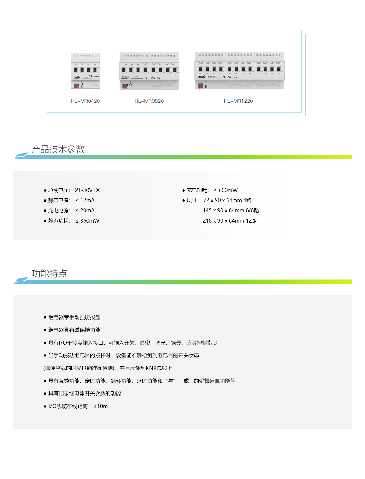 ● 继电器带手动强切拨盘 ● 继电器具有磁保持功能 ● 具有I/O干接点输入接口,可输入开关、窗帘、调光、场景、防等控制指令 ● 当手动拨动继电器的拨杆时,设备能准确检测到继电器的开关状态 (即便空载的时候也能准确检测),并且反馈到KNX总线上。