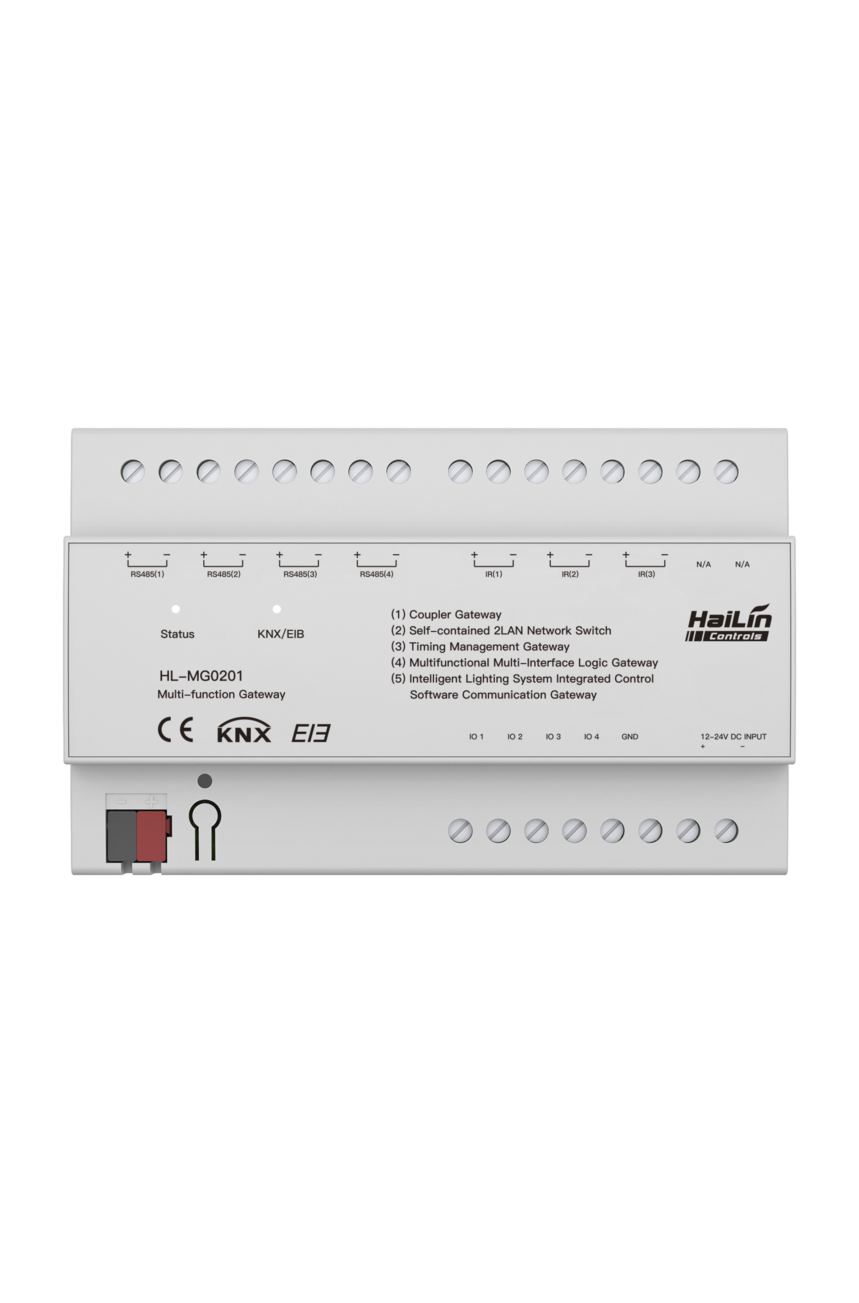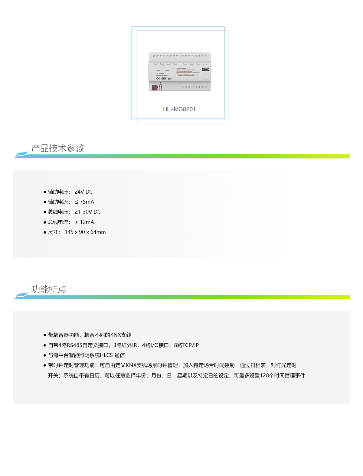功能特点 ● 带耦合器功能,耦合不同的KNX支线 ● 自带4路RS485自定义接口,3路红外IR,4路I/O接口,8路TCP/IP ● 与海平台智能照明系统HLCS 通信 ● 带时钟定时管理功能:可自由定义KNX支线场景时钟管理,加入特定场合时间控制,通过日程表,对灯光定时 开关;系统自带有日历,可以任意选择年份、月份、日、星期以及特定日的设定,可最多设置128个时间管理 事件