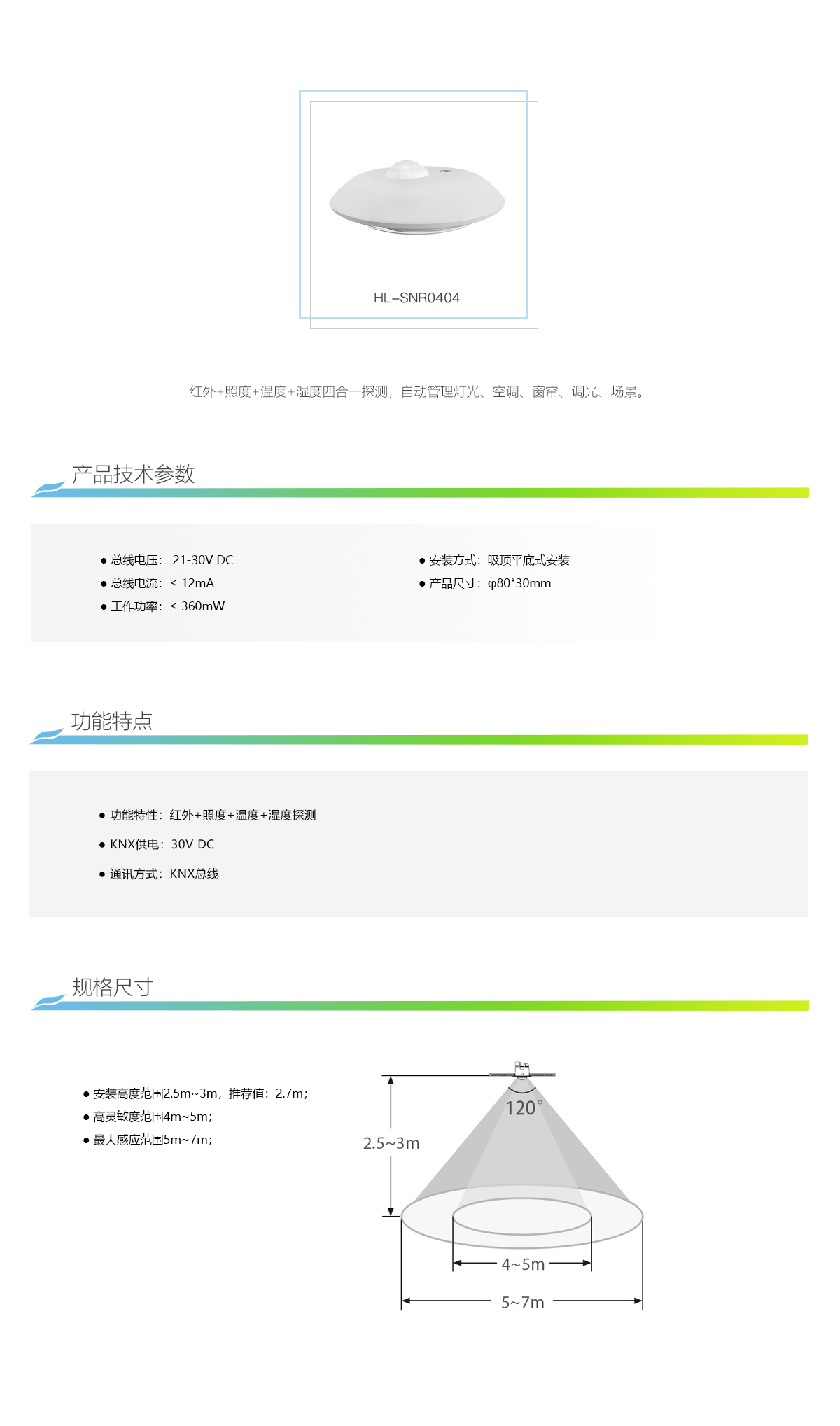 红外+照度+温度+湿度四合一探测,自动管理灯光、空调、窗 帘、调光、场景。