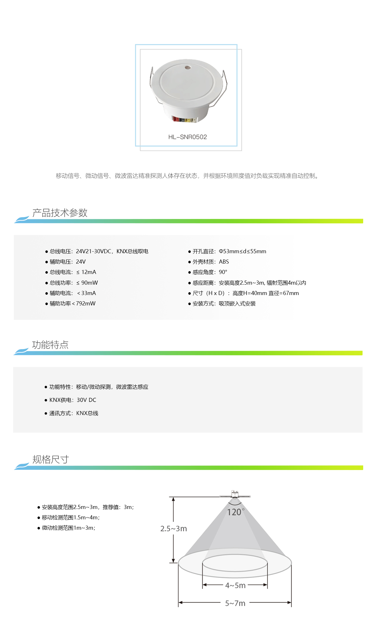 移动信号、微动信号、微波雷达精准探测人体存在状态,并根据 环境照度值对负载实现精准自动控制。