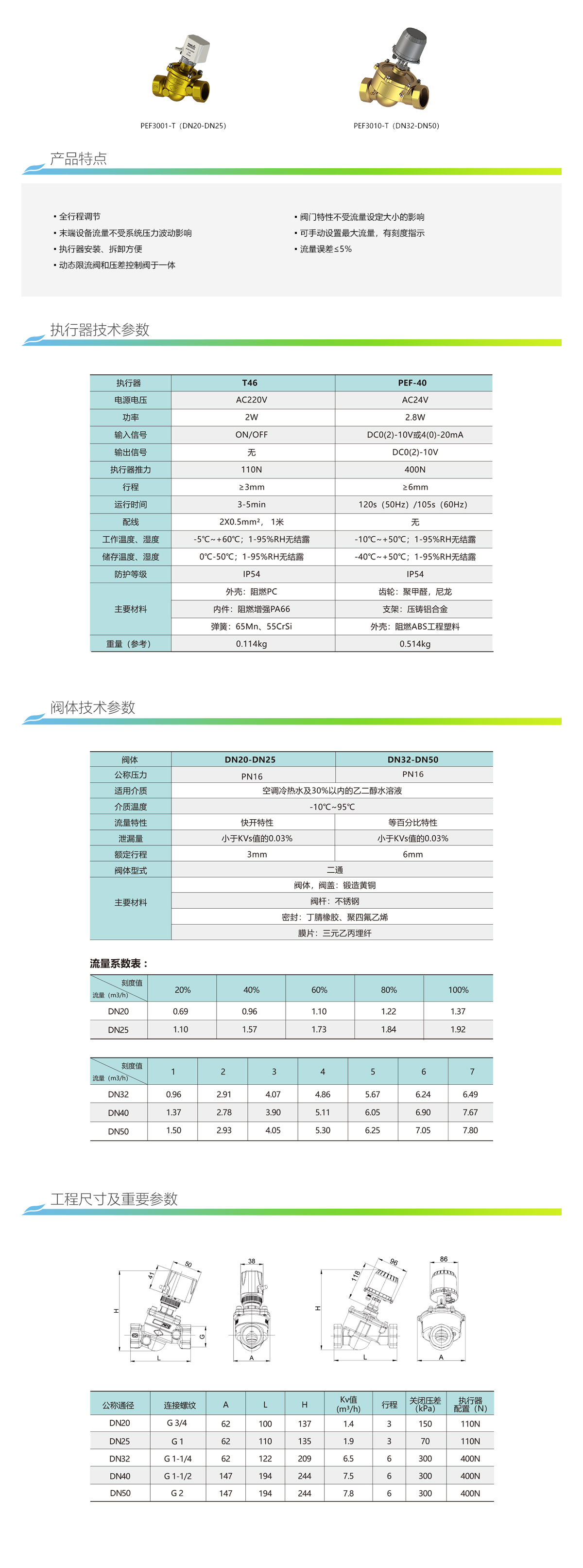 PEF30 系列电动平衡阀主要用于中央空调系统或供热采暖系统。用于控制空调末端设备或其他需要进行调节和平衡控制 的设备。执行器通过接受控制器的信号控制阀门的开度,可实现管道内介质流量大小的调节;可手动设置阀门最大流量; 平衡阀芯可保证系统流量不受压力变化的影响,使空调温度控制更精确无波动,提高空调系统的舒适性。 集电动调节、手动最大流量设定和动态平衡于一体。