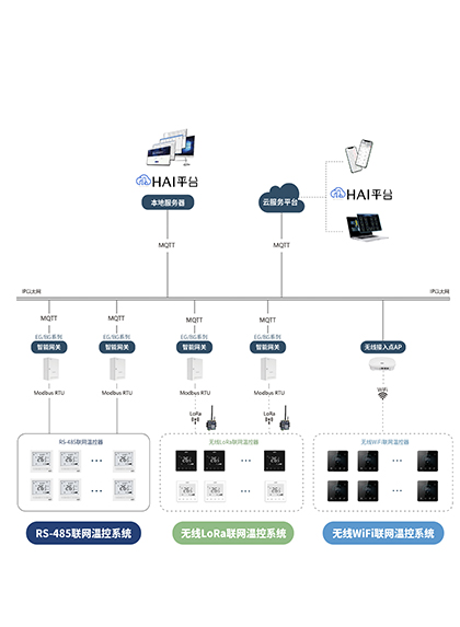 三种联网集控方式:RS-485 有线方式;LoRa 无线方式;Wi-Fi 无线方式。对所有末端温控器实现实时监控、远程管理、定时管理、分区管理、报警管理和历史数据存储等。定时、计时计费、锁定、温度变化监测于一体 实现严格控温,保证舒适的情况下减少能源消耗。