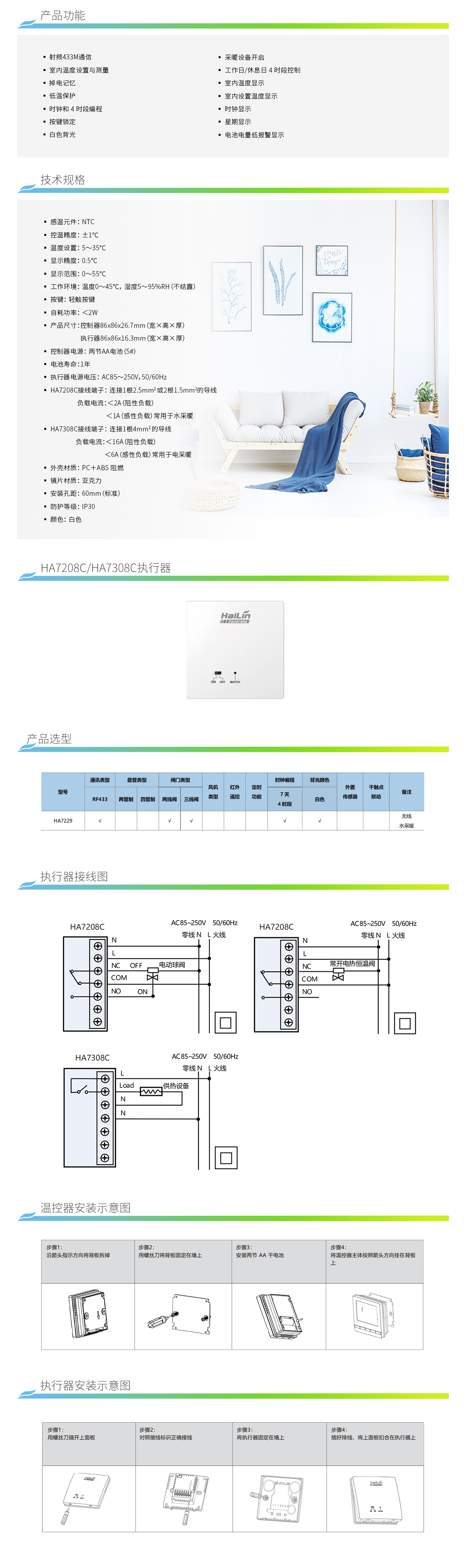 HA7229/HA7329系列无线采暖控制器可通过无线方式实现通讯 功能,减少现场施工布线,适合住宅的改造或新建项目上。 应用场景:住宅、办公写字楼、酒店、医院、商业楼宇及其它公 共建筑。 该产品需与HA7208C/HA7308C执行器配套使用,适用于室内温 度控制,控制采暖设备的开启与关闭。